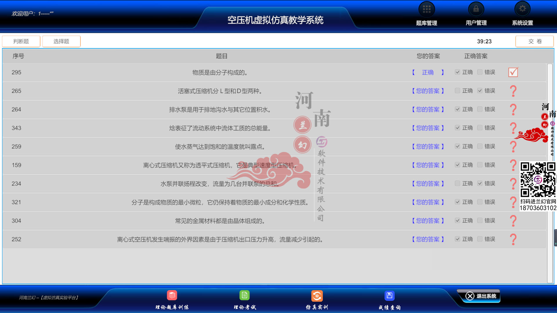 同樣教師也可以利用空壓機虛擬仿真實訓(xùn)教學(xué)系統(tǒng)對學(xué)生的知識水平和自己的教學(xué)進度有一個全面的掌握。教師可以從以下幾個方面對學(xué)生的學(xué)習(xí)情況進行了解。1.教師可以根據(jù)需要通過空壓機虛擬仿真實訓(xùn)教學(xué)系統(tǒng)來增加題庫的題目,在學(xué)生們進行課堂練習(xí)時了解學(xué)生的理論知識的掌握程度。2.空壓機虛擬仿真實訓(xùn)教學(xué)系統(tǒng)設(shè)置有考試系統(tǒng)。教師可以根據(jù)在考試系統(tǒng)里自由設(shè)置題目的數(shù)量以及成績分值的權(quán)重,教師也可以通過查看學(xué)生考試情況對學(xué)生有個更全面的了解。3.教師可以在實操中利用虛擬技術(shù)為學(xué)生重復(fù)操作器材,這樣不僅可以讓學(xué)生對儀器有個更加深入的了解同時也能極大的降低儀器的使用耗損,延長儀器的使用壽命。4.教師同樣也可以通過虛擬仿真教學(xué)系統(tǒng)自帶的用戶管理系統(tǒng)對每臺電腦上的學(xué)生登錄情況進行系統(tǒng)的了解,從而極大程度避免了一些意外的發(fā)生。