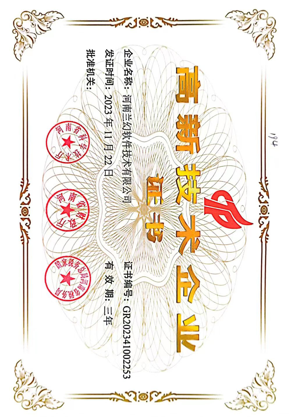 2023年再次被河南省科學技術廳、河南省財政廳、國家稅務總局河南省稅務局三方認證“高新技術企業”。